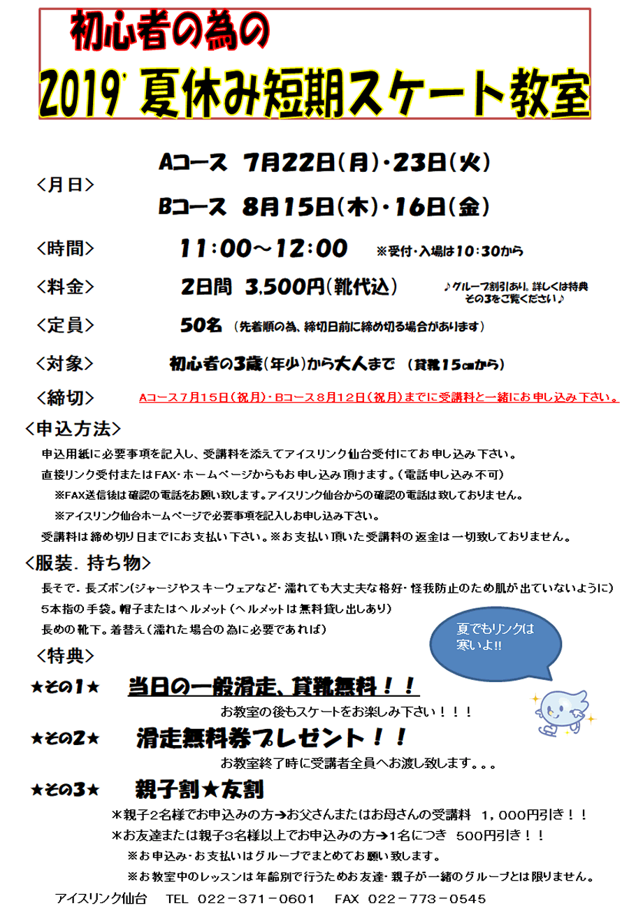 >2019夏休み短期スケート教室 定員に達しましたので締切とさせて頂きます。