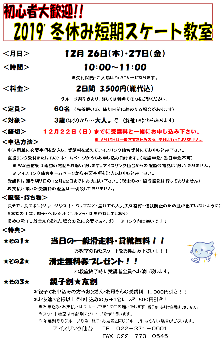 2019冬休み短期スケート教室 ※定員に達しましたので締切とさせて頂きます。